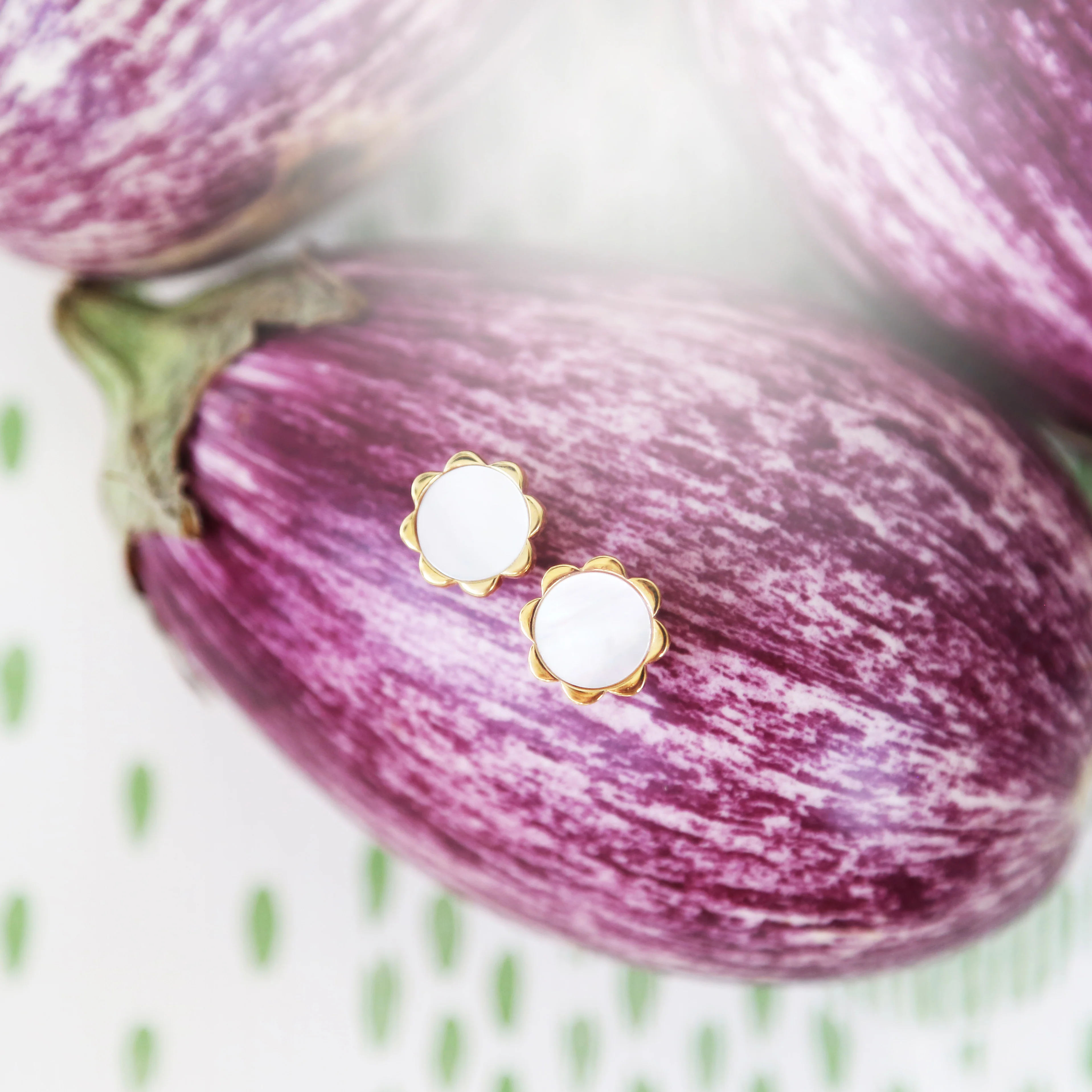 14k gold dipped flower stud with mother of pearl. These 11 mm studs are the perfect go-to earring.