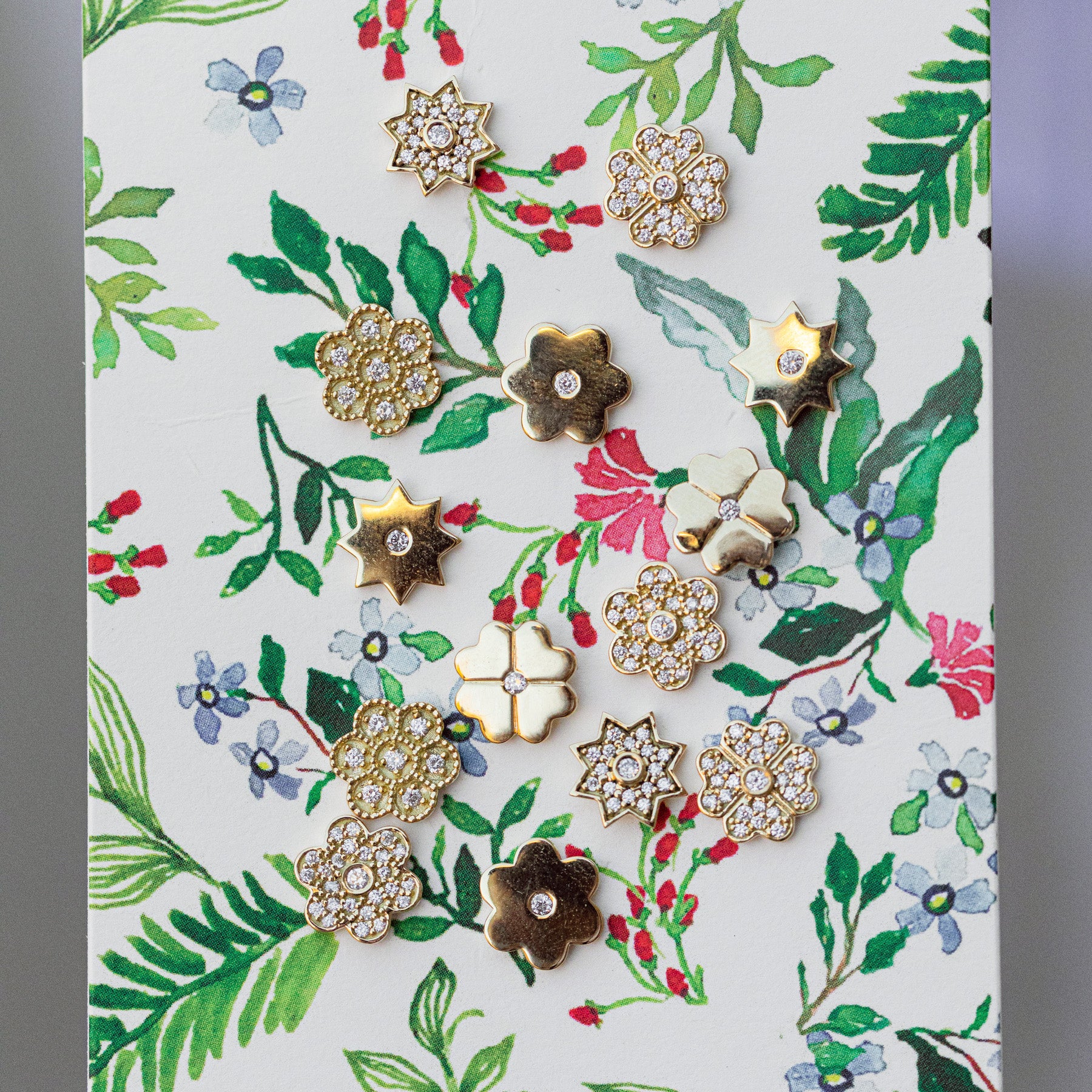 Inspired by the designer's favorite lucky charms, these 18k gold kismet pave diamond studs are delicate and add a touch of understated elegance.